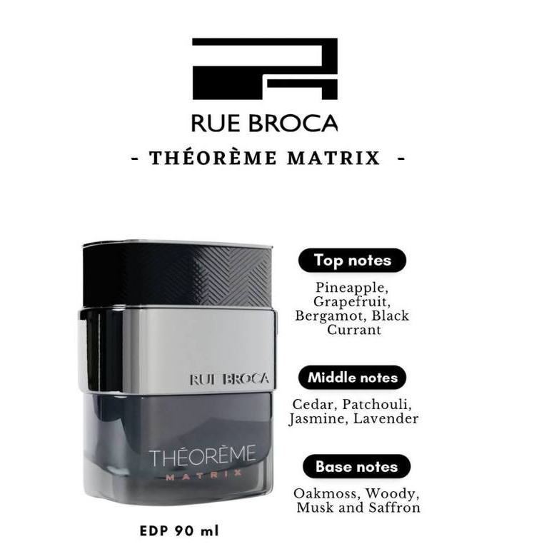Theoreme Matrix by Rue Broca POUR HOMME | 90 ML | EDP A harmonious masculine blend that exudes confidence and allure. This olfactory masterpiece combines the sophistication of rich, fruity notes of black currant and the warm, spicy allure of saffron, resulting in a scent that is both elegant and enigmatic